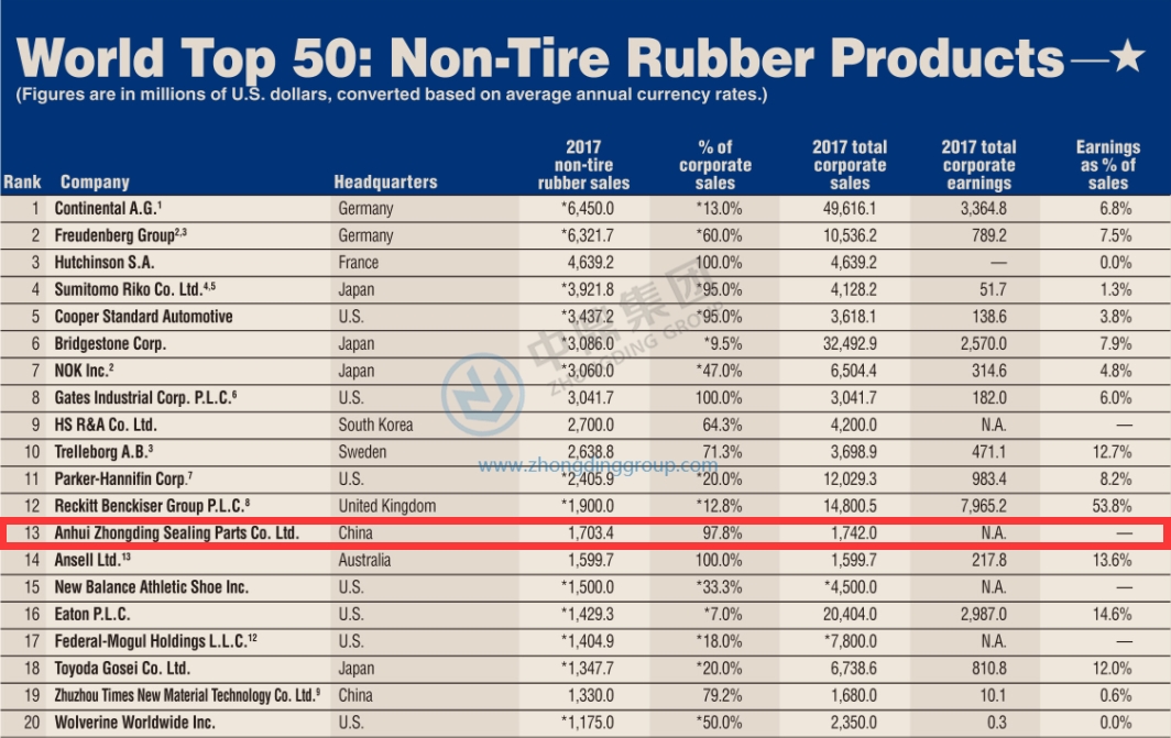 近日,美國《橡膠與塑料新聞》周刊公布了2018年全球非輪胎橡膠制品50強排行榜,中鼎繼2016年首度躋身前20名后,位置繼續(xù)前移,位列全球第13位。