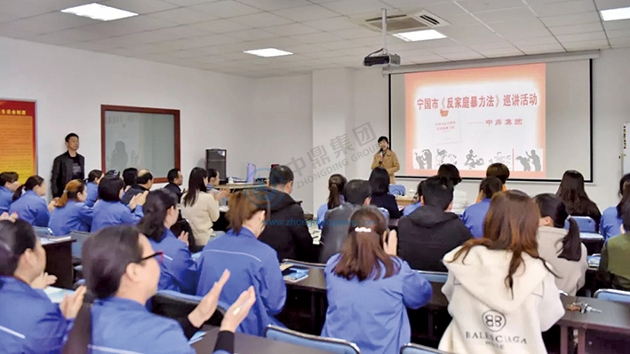 《反家庭暴力法》巡講活動走進中鼎 3月22日下午,寧國市《反家庭暴力法》巡講活動走進中鼎集團,寧國市婦聯(lián)副主席張春梅一行及各下屬公司代表共60余人參加了會議。 會議開始前,工作人員給與會人員發(fā)放了反家庭暴力、婦女維權知識等宣傳資料。 本次講座邀請了寧國市安徽向群律師事務所雷緒琴律師授課。雷律師通過典型案例就反對家庭暴力實際問題為大家講解法律法規(guī)知識,她對《反家庭暴力法》的頒布實施、婦女如何保護自己的合法權益、婦聯(lián)在反家暴中如何開展工作進行了講解。培訓過程中還進行了問答互動,加深大家對《反家庭暴力法》的理解。
